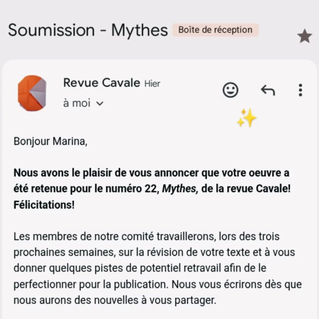 C’est avec joie que j’ai réceptionné le mail qui annonçait mon poème sélectionné pour ce numéro 22 de la revue ! Un formidable moment d’écriture pour un merveilleux résultat dont j’en avais soupçonné l’issue favorable pour être honnête !👅Je suis totalement ravie d’avoir eu foi à mon texte, preuve que croire hautement en ses écrits n’est pas synonyme d’hubris néfaste. Sur ce, à bientôt pour découvrir mon texte dans la revue très prochainement !