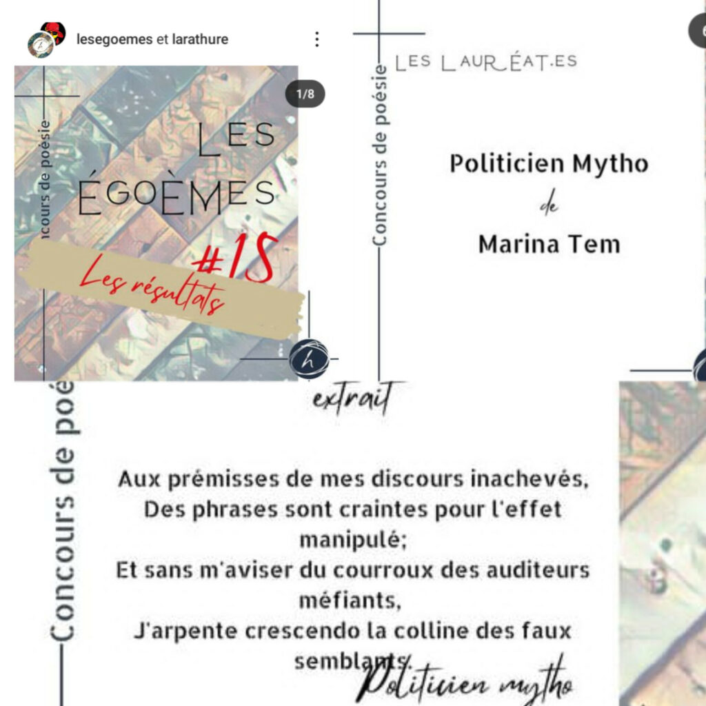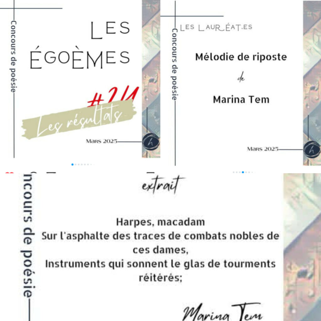 Après une période de césure, le concours de poésie Les égoemes longtemps mis en berne par l’organisateur, a repris du poil de la bête depuis l’amorce de cette année 2025. Il est donc ouvert à compétition mensuel depuis Janvier et a porté en ce mois de Mars, une joute de plus dont les résultats glorieux de ma participation à cette dernière m’ont ravie.
