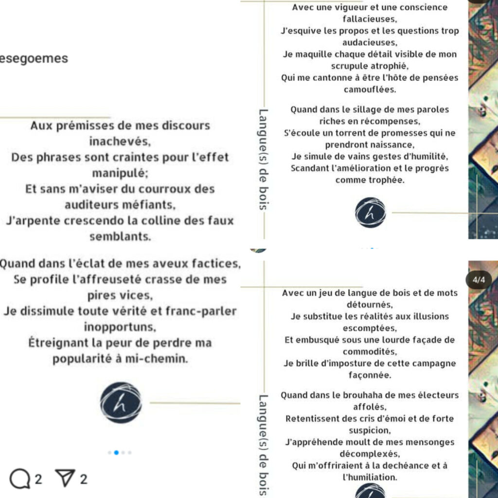 Langues de bois était un sujet assez important car il racontait idéalement la mesure des constats alarmants liés à la démagogie des dirigeants africains. Nul doute n’a été en moi quant à diriger l’interprétation et la rédaction de mon poème vers ces beaux parleurs qui s’éternisent aux arcanes des pouvoirs africains. Un engagement qui a bien été récompensé et j’en ai été toute satisfaite.