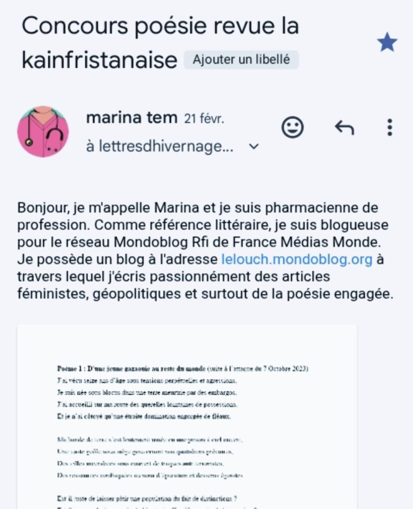 C’est en donnant un prisme de revendications à ces voix effacées que j’ai pris la décision de participer effectivement à ce concours aux portées humanitaires et solidaires. Une transmission de trois de mes textes jadis publiés sur mon blog ont eu le privilège d’être envoyés selon les modalités.